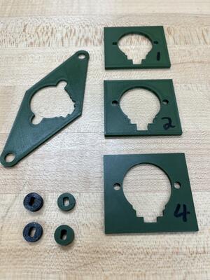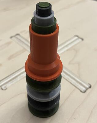For connecting with the base, my initial thought was to use a short pin on the base to position the centermost shaft. I designed and 3D printed a test fit with spacers. It was a reasonable fit, but turning the shaft had some wobble.