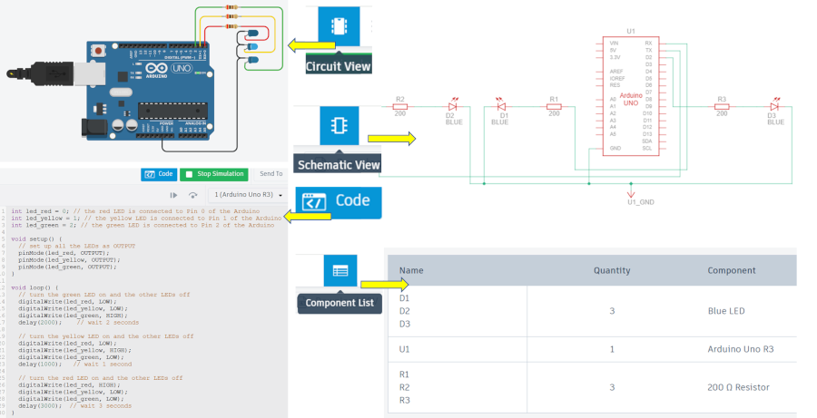 Circuit View shows the project in a realistic breadboard form, while Schematic View presents the same circuit as an electrical diagram. The Code section contains the Arduino program that controls the components, and the Component List shows all the elements used in the design. Together, these four sections help students understand a project from practical, logical, programming, and material perspectives.