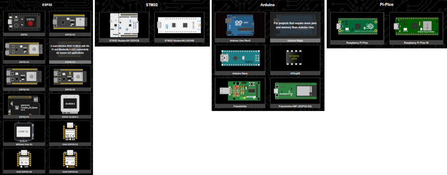 The following microcontrollers are currently supported: - AVR: ATmega328P (Arduino Uno, Arduino Nano), ATmega2560 (Arduino Mega), ATtiny85 - ESP32: Xtensa: ESP32, ESP32-S2, ESP32-S3 - RISC-V: ESP32-C3, ESP32-C5*, ESP32-C6, ESP32-H2, ESP32-P4 - STM32: STM32C031, STM32L031, STM32F103C8 - Pi Pico: RP2040 (Raspberry Pi Pico), a dual-core ARM Cortex-M0+ microcontroller