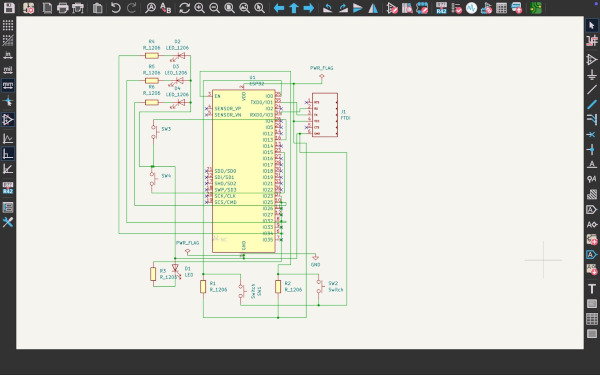 In schematic part, we picked up the Microcontroller, ESP32-WROOM-32U , boot/reset control, a UART header for programming, a few GPIO break-outs, and three indicator LEDs around it. Two LEDs (L1, L2) each have a series resistor (R1, R2, 1206 package). Headers labeled SV1 / SV2 / SV3 break out several GPIO pins (e.g., IO1…IO10 etc.) plus power/ground for hooking up sensors/actuators.