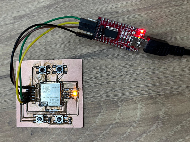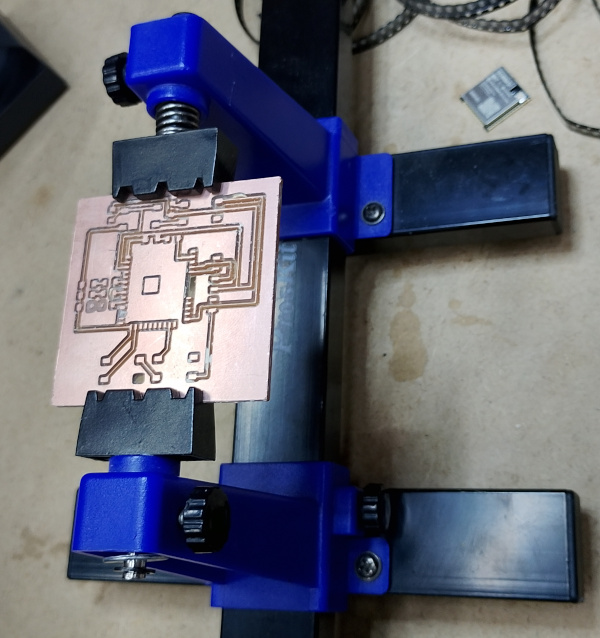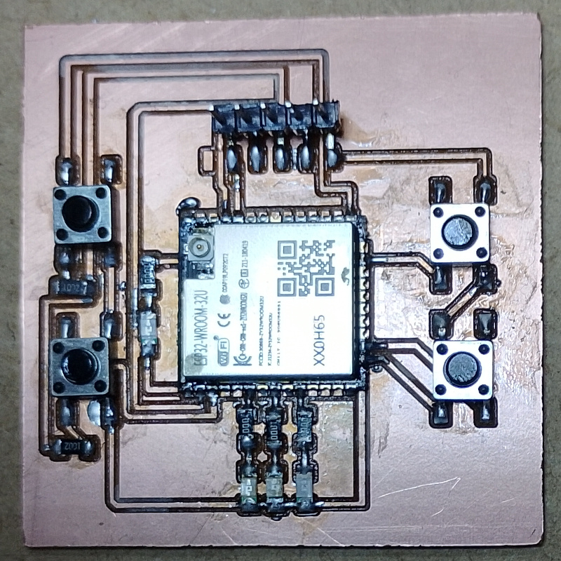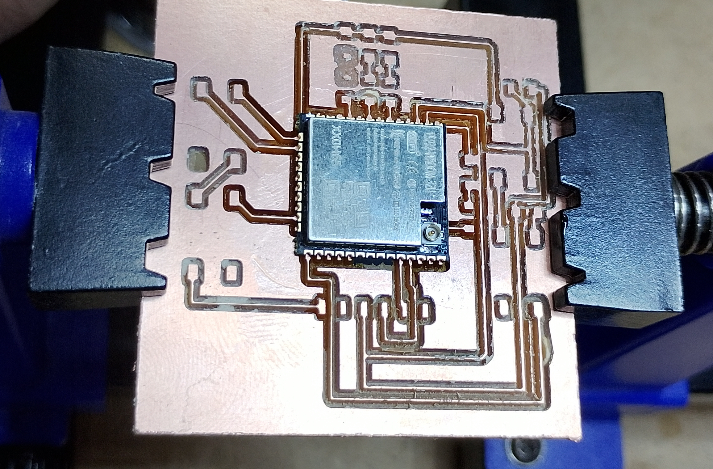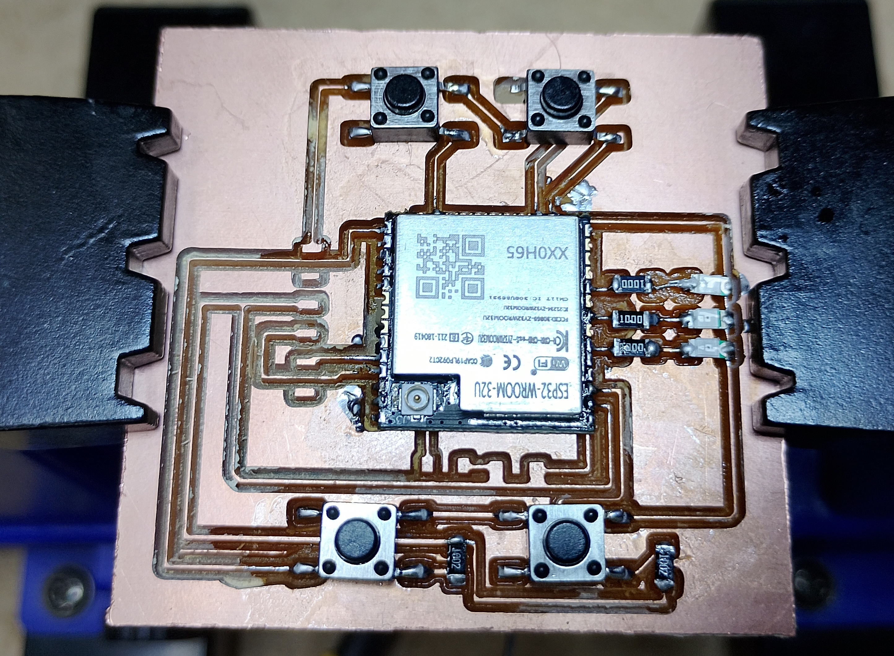 We assemblied the milled PCB, ESP32-S3 module, SMD passives, LEDs, buttons, and headers—with the board in a PCB vise.