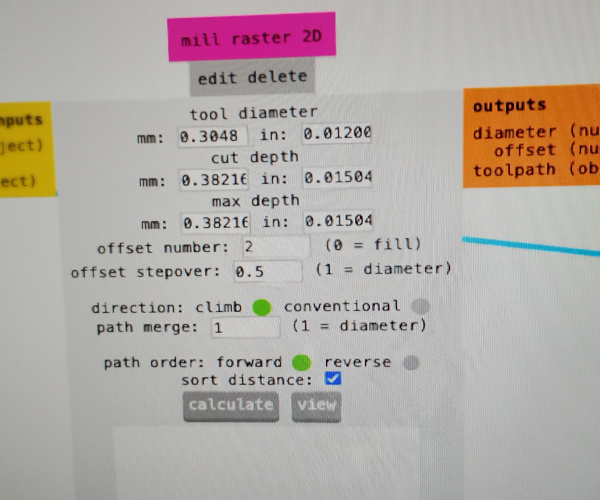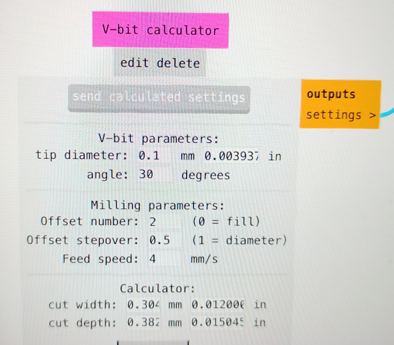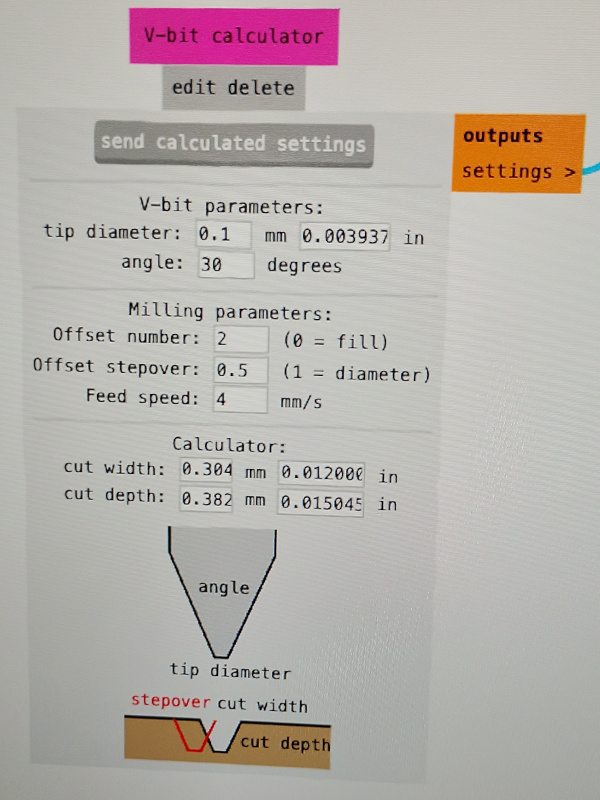 Then we changed the V-bit values to match tool: here a 30° V-bit with 0.1 mm tip, 2 offsets, 0.5 stepover, feed 4 mm/s This selected values gaved cut width ≈ 0.304 mm (12 mil) and cut depth ≈ 0.382 mm.
