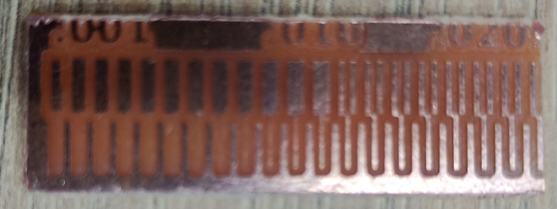We changed the cut depth = max depth = 0.10 mm (vs. 0.38 mm before) with a 30°/0.1 mm V-bit → effective tool width ≈ 0.305 mm (12 mil) and kept 2 offsets and 0.5 stepover. Its path order corrected forward, climb cut.