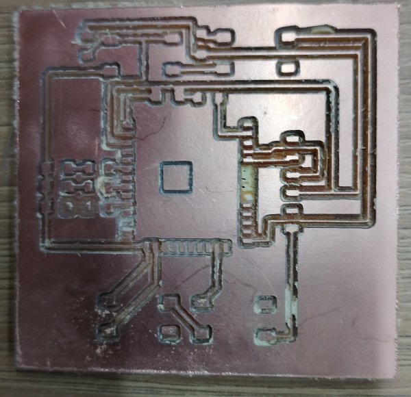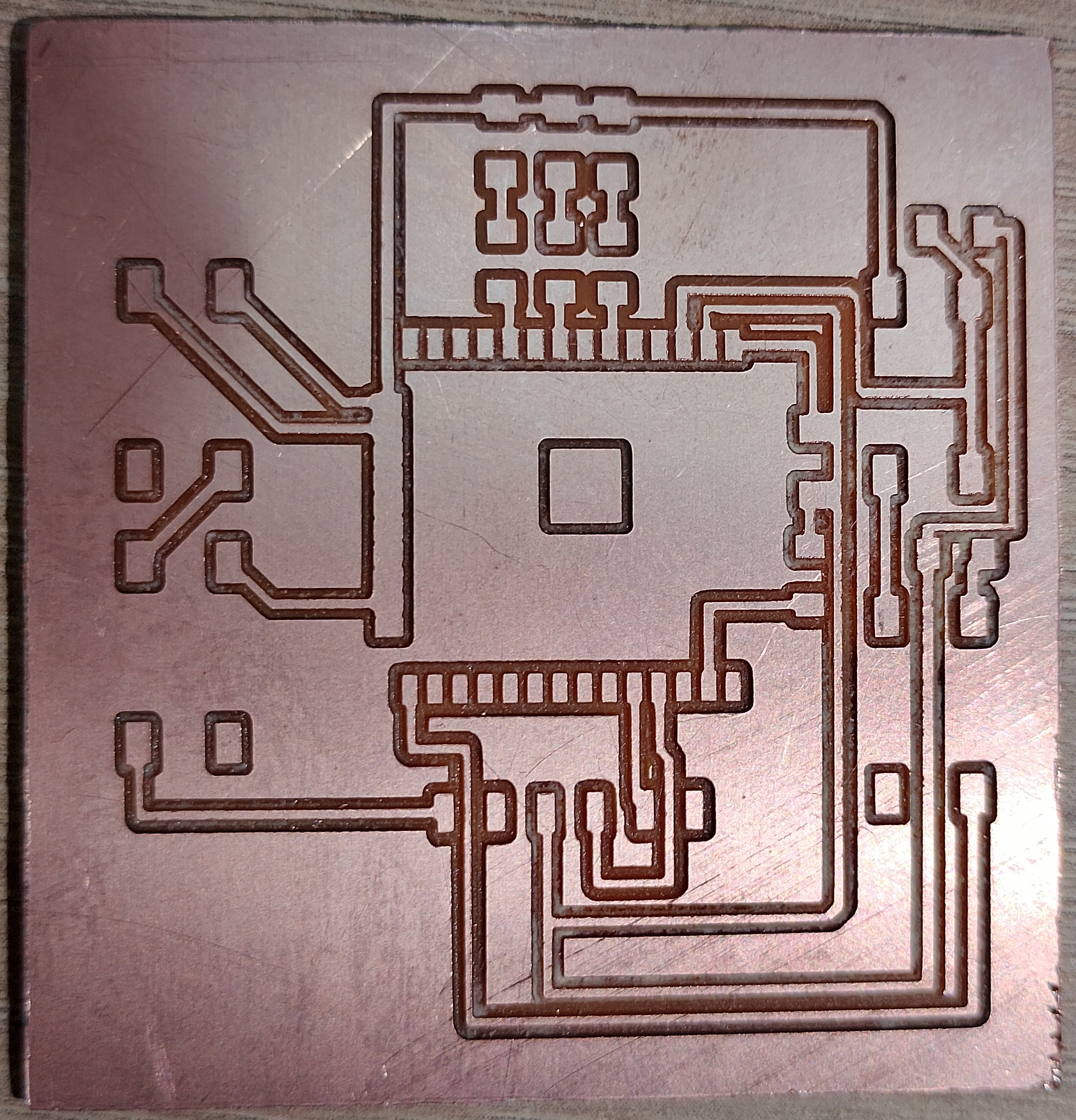 Our board showed poor result as it made uneven isolation widths, ragged edges, and patches of copper left behind. It showed that spoilboard was not perfectly coplanar, so the V-bit cuted too deep in some areas and barely touches in others. a V-bit at~0.38 mm made huge, blowing out traces and leaving torn copper. Tool width/DPI in mods didn’t match, so paths were spaced wrong; chips weren’t cleared between passes.