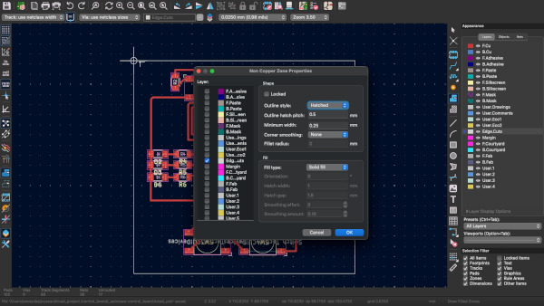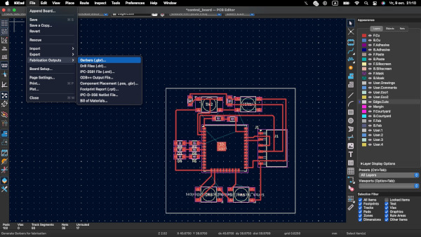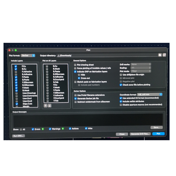 in KiCad opened File → Fabrication Outputs → Gerbers… to generate the manufacturing layers for our board. In the Gerber dialog, we selected the layers we need (F.Cu/B.Cu, F.SilkS/B.SilkS, F.Mask/B.Mask, Edge.Cuts), set the plot format, then clicked Plot; next opened Generate Drill Files… to create the Excellon drills. Finally, zip the Gerbers + drills and inspected them in Gerber Viewer to verify registration, holes/slots, and polarity before sending to a board house or milling workflow.
