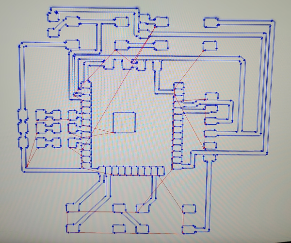 Toolpath preview shows Blue lines which are isolation passes, red lines are rapids; we generated 2 offsets around every white copper region so traces stay insulated.