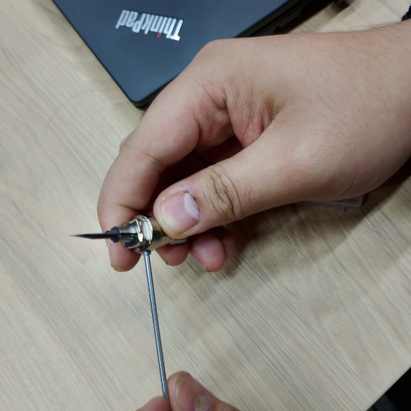 The we setuped the Desktop CNC with dust extraction; MDF spoilboard installed and squared. V-bit mounted, XY zero set to the board corner; Z zeroed on copper using the paper-touch method.