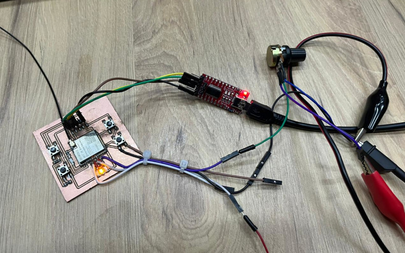 In order to make the Analog Input Setup, I connected a potentiometer as a variable voltage source (3.3 V → wiper → ESP32 ADC pin → GND) to test analog reads. The FTDI adapter powers/programs the board, and the status LED confirms the microcontroller is running while I sweep the knob to change the input level.