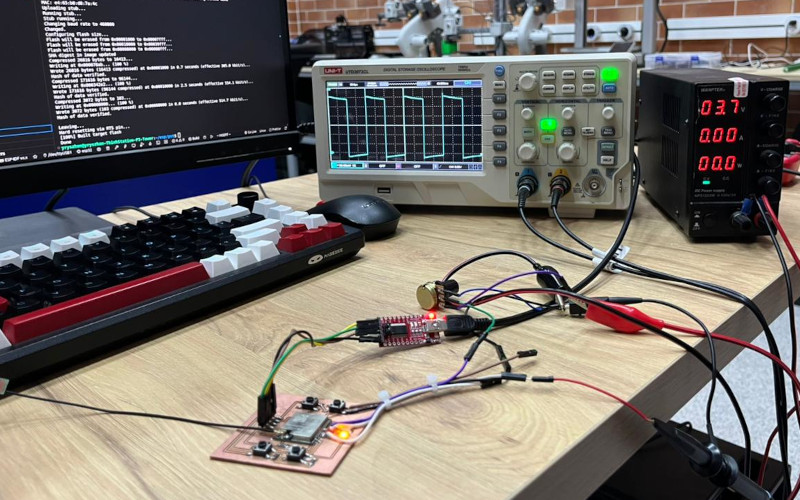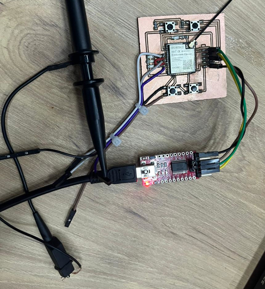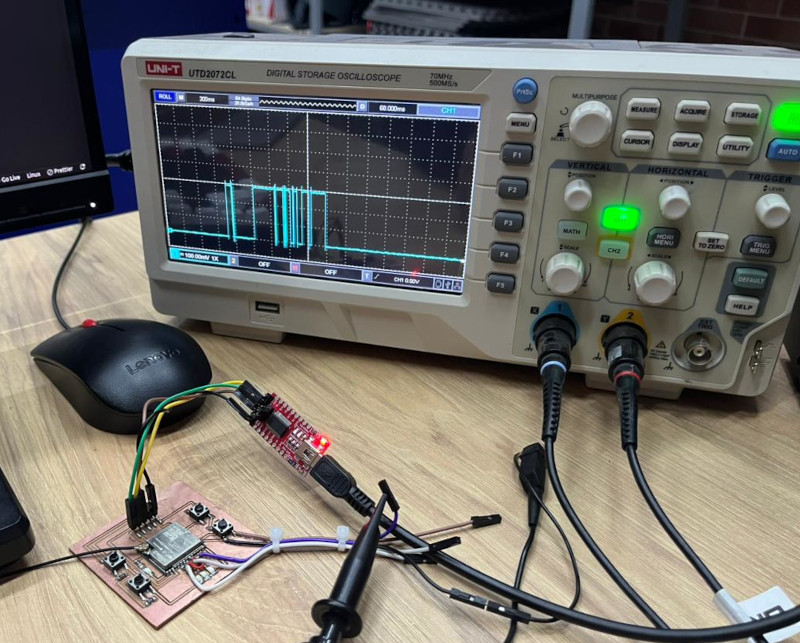 Finally, the board was powered via a USB-UART (FTDI) adapter wired to 3V3, GND, TX, and RX; the status LED confirms the ESP32 boots. With this setup I could upload program and run a simple blink/button test to verify basic I/O. Here I probed the UART and GPIO lines to validate signal integrity and timing during boot and button presses. A few jumpers were added to bypass fragile traces; after confirming clean 3.3 V and stable serial activity, the board communicated reliably. Power-up and Programming Test were succesful.