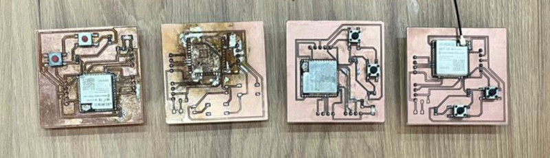 These four boards show our build history: the first three attempts failed due to under-etched/weak signal traces that lifted during soldering and created intermittent shorts. We improved the milling settings, widened critical traces, and added plenty of flux and touch-up jumpers to repair breaks. The fourth board passes continuity and boots reliably—confirming the layout and assembly process.