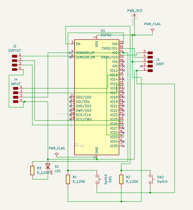 The previously created at electronic production assignment, the KiCad schematic of my ESP32-based board was resued to do the assignment. It has the 3.3 V rail, EN line, a UART header for programming, I/O headers for inputs (J4) and outputs (J2), two momentary switches with resistors, and an indicator LED with its current-limit resistor.