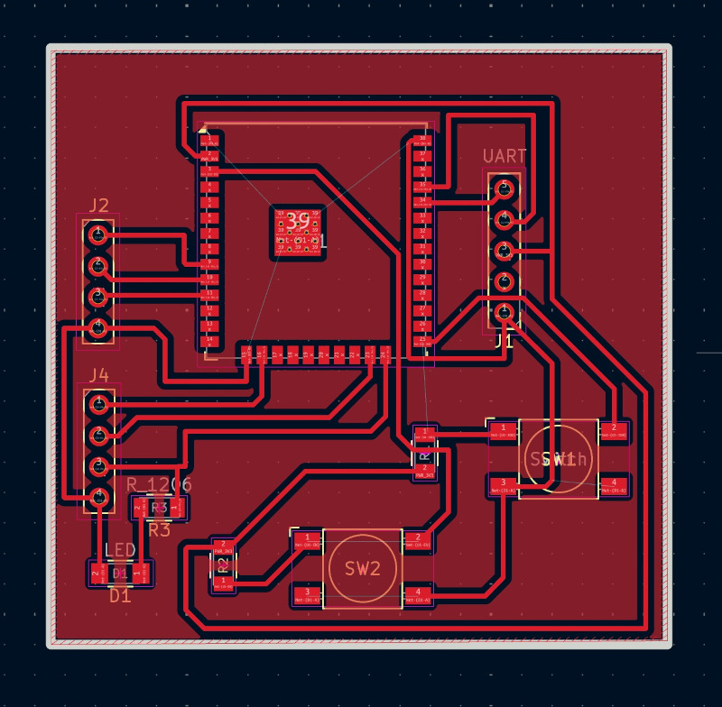 Then the routed PCB was generated from the schematic, where power traces are kept wider than signal traces, and the buttons and LED are placed.