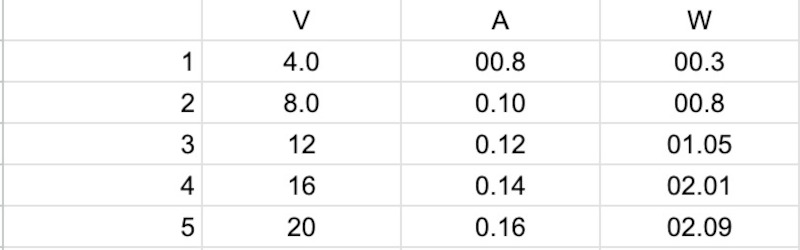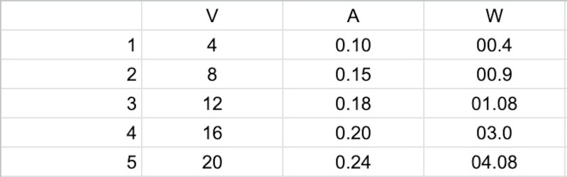 In the following part of the experiment, the TT Gear Motor was tested and the V–I–W Table was created. I stepped the bench supply from 4–20 V and recorded the current of a plastic TT gear motor, then computed power (W = V×A). As expected, current and input power rose with voltage; as noted this was a brief, no-load characterization and 20 V is above the motor’s typical 3–6 V rating, so it’s not suitable for continuous use. The programmable supply let me sweep voltage in constant-voltage mode while watching the built-in current readout. Using current limit (CC) protected the motor during sudden load changes and avoided accidental stalls.