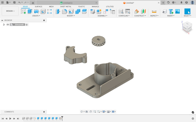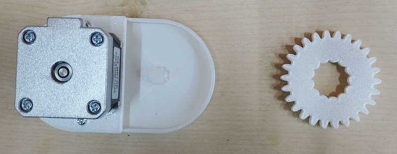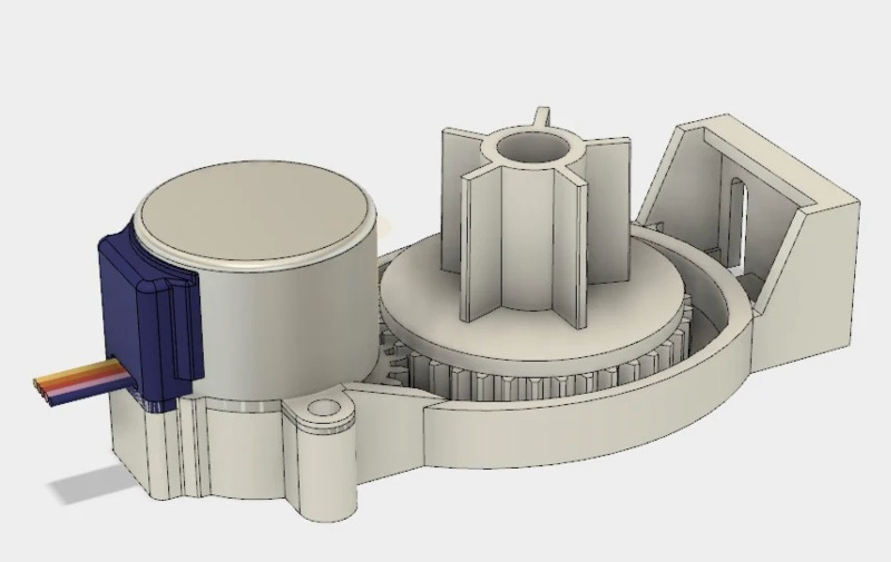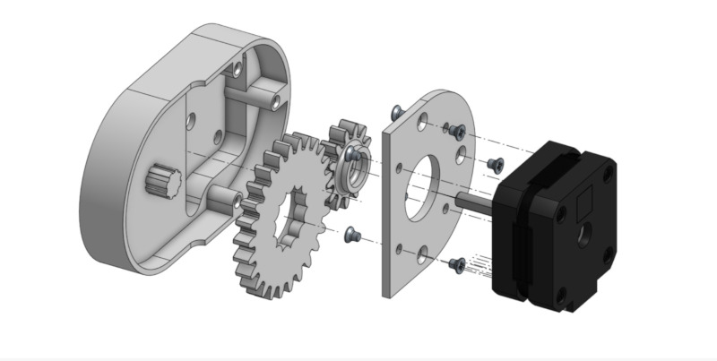 This image showed an exploded view of a compact gearbox/enclosure: internal ribs, two spur gears, a front plate, and a stepper motor aligned on one shaft axis. This helped me to understand the the visuals, that communicate how the printed parts, gears, and motor come together to grip and drive a roller-blind bead chain.