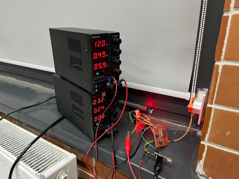 We made a prototype test setup for the motorized roller-blind module. The bench power supply was stacked on the windowsill with 12 V. As illuminated LEDs showed that the circuit was powered and active.