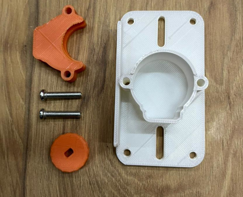 After the size adjastment, the 3D-printed parts and assembly of a roller-blind chain motor mount was reprinted. As shown here, we had three parts: the white base plate with elongated wall slots, an orange clamp piece, a printed sprocket, and two screws.