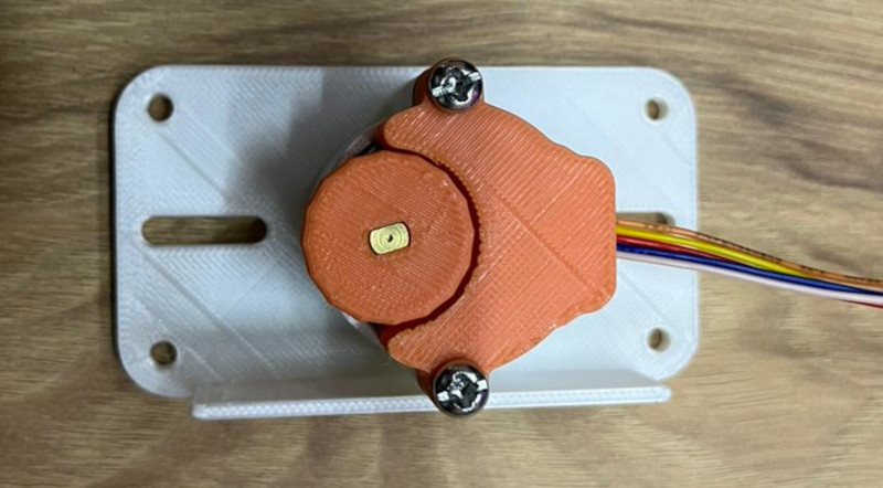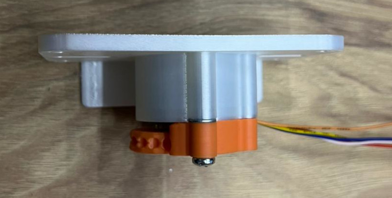 Then the motor was mounted to the base, the orange clamp locks it in place, and the wiring exits to the right, and three screws secure the clamp and sprocket hub, aligning the motor shaft through the center opening. The cylindrical motor pocket and the bead-chain sprocket positioned were ready to use.