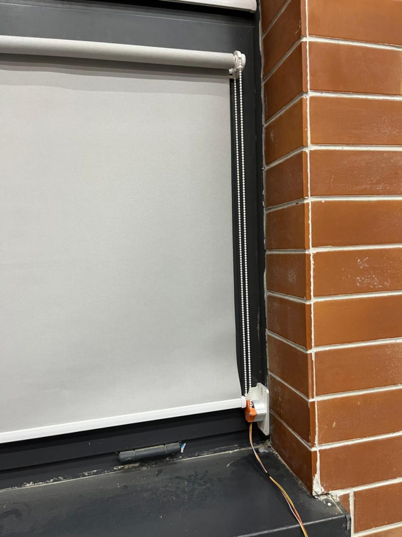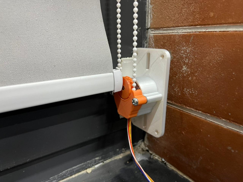 We installed the motorized roller-blind module installed on a operating window, where the printed white base is wall-mounted near the blind bracket, while the orange clamp holds the motor and bead-chain sprocket in line with the chain. The bead chain drops neatly over the sprocket, indicating proper engagement and tension.
