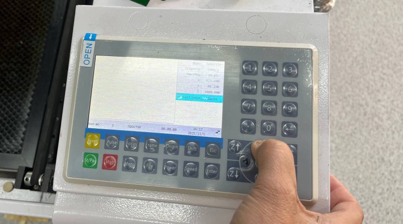 In this photo, I pressed the “Start” button to begin the laser cutting job. At this stage, the machine follows the toolpath generated from my DXF file and starts cutting the shapes exactly as designed.