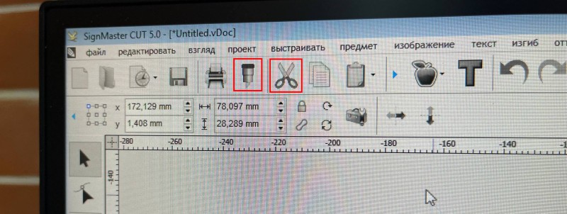Next, I switched to SignMaster CUT 5.0, which is used to control the vinyl plotter. I selected the project and cutting tool icons to prepare the job configuration.