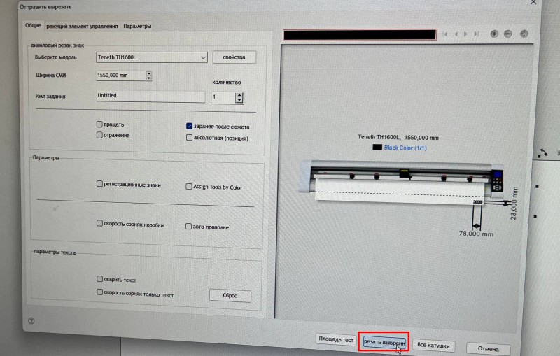 In the cutting configuration window, I selected the correct plotter model (Teneth TH1600L) and confirmed the material width. I checked the preview to make sure the text was positioned correctly on the vinyl sheet. After confirming the parameters, I clicked “Send to Cut”.