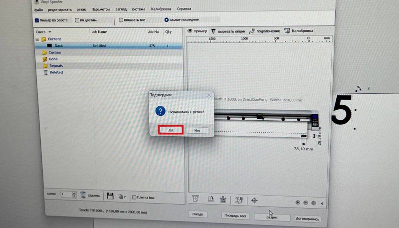 A confirmation dialog appeared, asking if I wanted to proceed with cutting. I clicked Yes to start the cutting job. The plotter began cutting the numbers on the vinyl sheet.