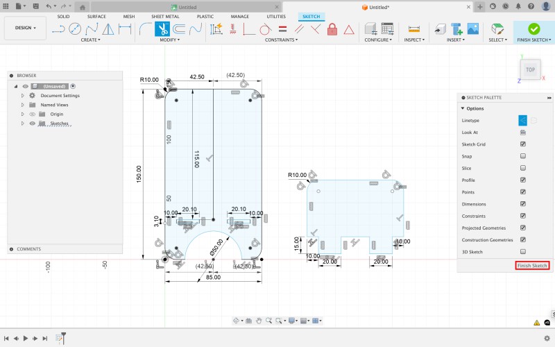 I continued refining the sketch, adding detailed dimensions for all parts that would later be cut.