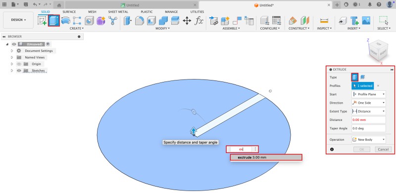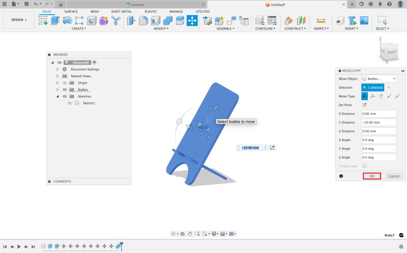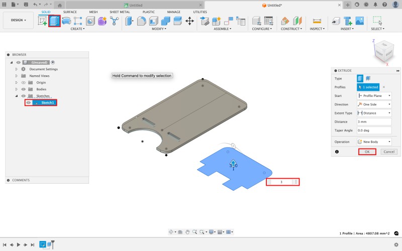 I extruded the sketch to a height of 3 mm to match the thickness of my material, creating solid bodies for the stand components.