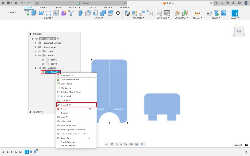 I selected the sketch and exported it as a DXF file, which is required for laser cutting.