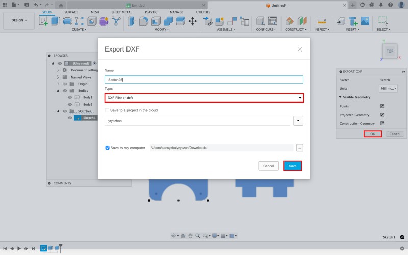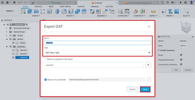 I saved the exported DXF file to my computer so it could be sent to the laser cutter.