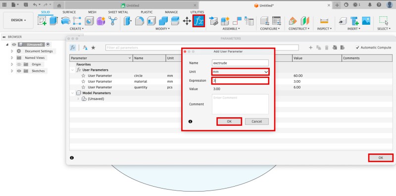 Here I created custom parameters using the “fx” Parameters tool in Fusion 360. I added a parameter named extrude with the unit mm so I could control the extrusion height later. Defining parameters at the beginning makes the whole model fully adjustable.