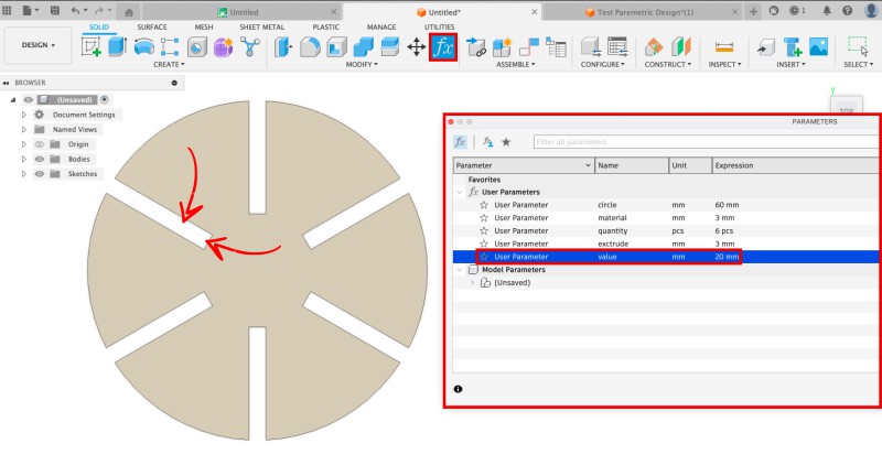 Here I modified the value parameter in the Parameters window. Once updated, Fusion 360 automatically regenerated the geometry. The red arrows show which parts of the model changed according to the new parameter values.