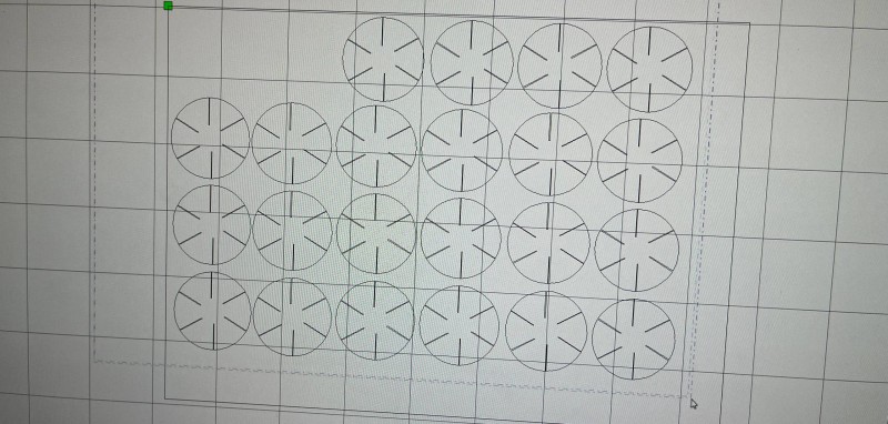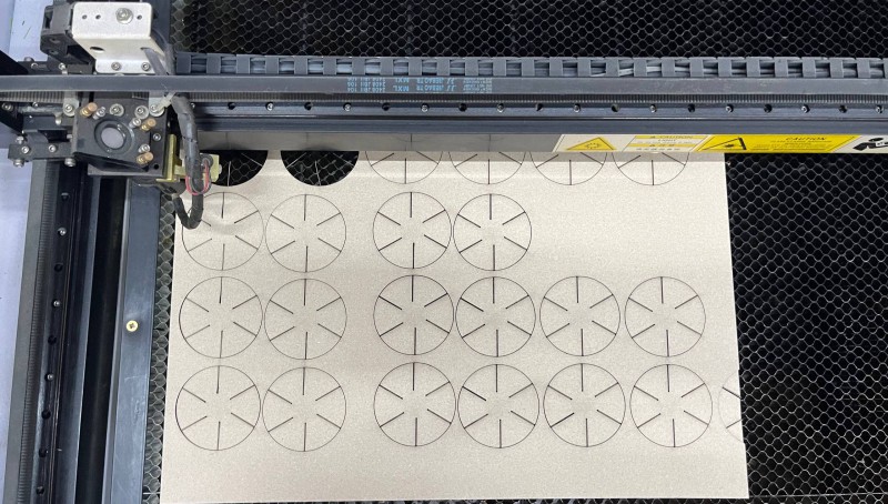 This image shows the laser machine in action. I am cutting my parametric circular parts, which I modeled and exported earlier. You can clearly see the clean cut lines forming on the material as the laser moves across the surface.