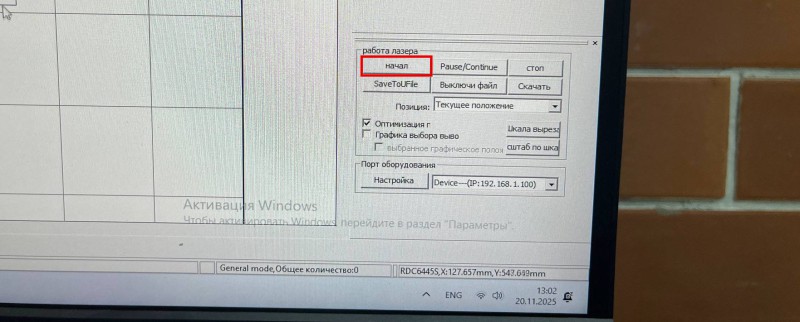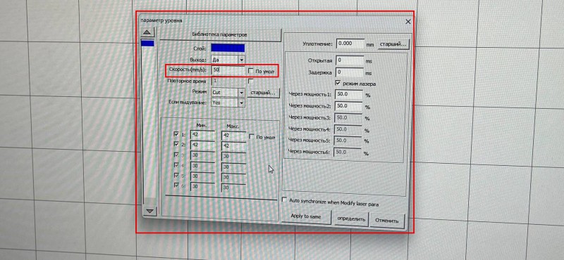 This photo shows the parameter window where I configured the cutting speed, power, and other essential settings for my material. Choosing the correct parameters is crucial when working with different materials to ensure good edge quality and avoid burning.