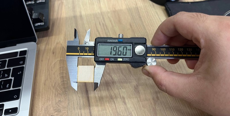 After cutting, I measured the actual size of the piece with a digital caliper. Instead of 20.00 mm, the result was 19.60 mm, which means the laser removed some extra material along the outline.