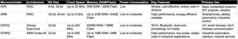 ESP Microcontrollers The ESP8266 and ESP32 are popular microcontrollers designed for Internet of Things (IoT) applications. These microcontrollers are ideal for cloud-based applications, wireless communications, and smart home automation due to their built-in Wi-Fi and Bluetooth capabilities. Among IoT projects, the ESP32 is widely used for its advanced features and versatility.
