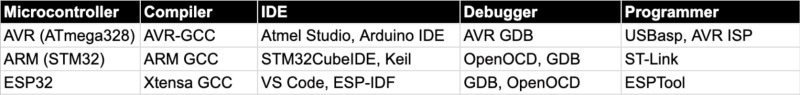 Compiler: Transforms high-level code (C, C++) into machine code. Examples include GCC, Clang, IAR, and Keil. Assembler: Converts assembly language into binary instructions. Common assemblers include GNU Assembler and NASM. Linker: Combines compiled code and libraries to construct an executable. Examples include GNU LD and Keil Linker. Debugger: Enables step-by-step execution for troubleshooting. Popular debuggers include GDB, OpenOCD, and J-Link Debugger. Integrated Development Environment (IDE): Provides a complete development environment. Examples include VS Code, Eclipse, Keil, STM32CubeIDE, and Arduino IDE.
