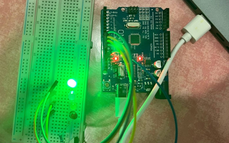 We assembled a small circuit prototype using a breadboard, three LEDs, 100 Ω resistors, male-to-male jumper wires, and an Arduino Uno. I created a mini version of a running light effect using the three LEDs and wrote the code in PlatformIO using C++. The result turned out quite good.