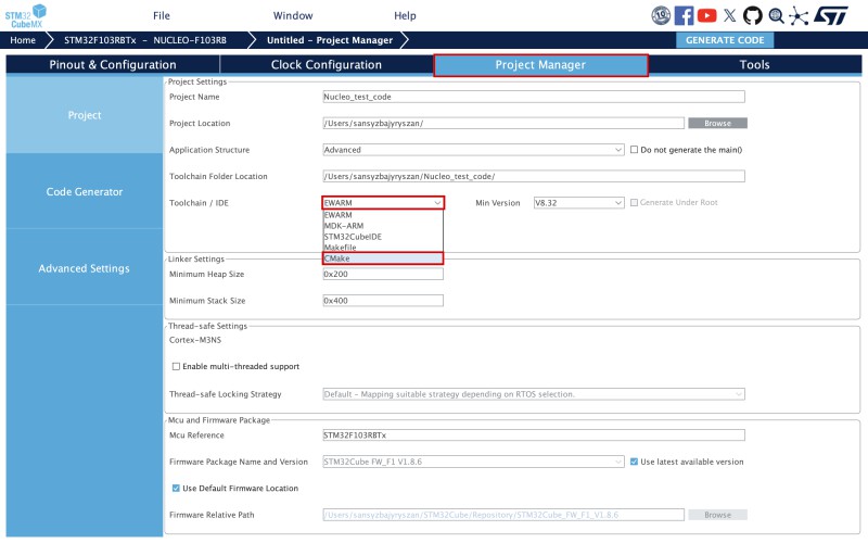 We first created a new project in STM32CubeMX, configured the pins in output mode to connect the LEDs, and selected CMake as the toolchain.