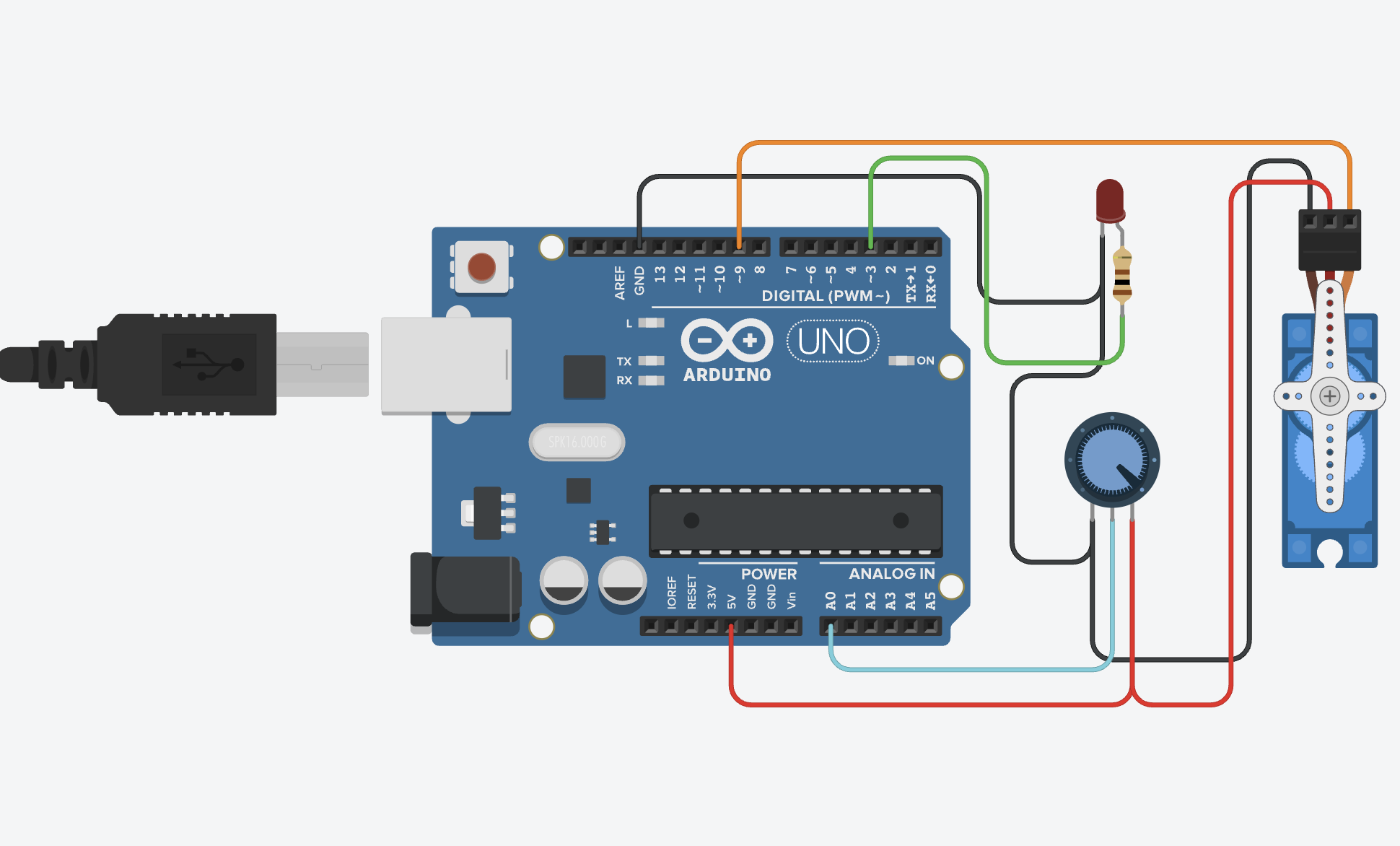 I created a circuit in Tinkercad to control a servo motor and an LED using a potentiometer. The components I used include a servo motor, a resistor, an LED, and another servo motor.