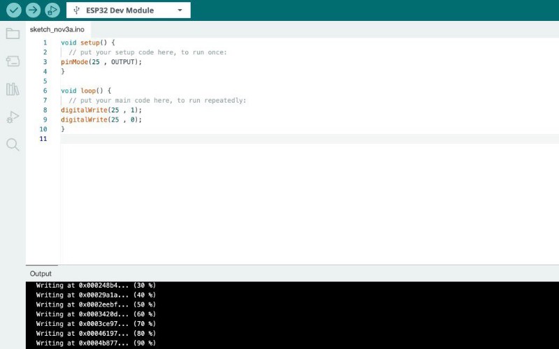 For this simple test, I used the Arduino IDE to control an LED connected to GPIO 25 on the ESP32. In the setup() function, I configured the pin as an output using pinMode(). Inside the loop(), I repeatedly set the pin HIGH and then LOW using digitalWrite().