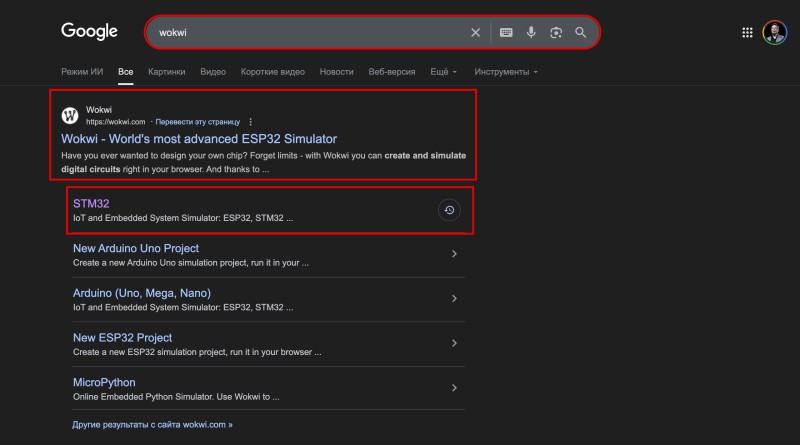 I searched for “Wokwi” on Google. The first result shows the official website of Wokwi, an advanced STM32 simulator.