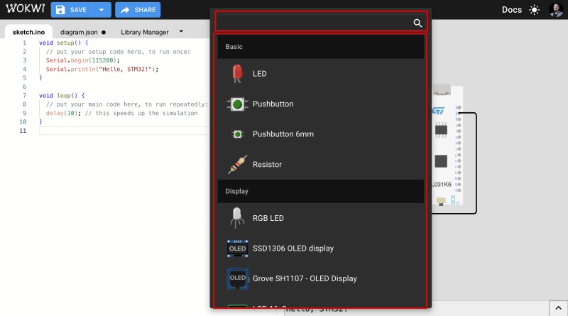 This is the component search panel in Wokwi. Here I can search and add components such as LEDs, pushbuttons, resistors, and OLED displays.