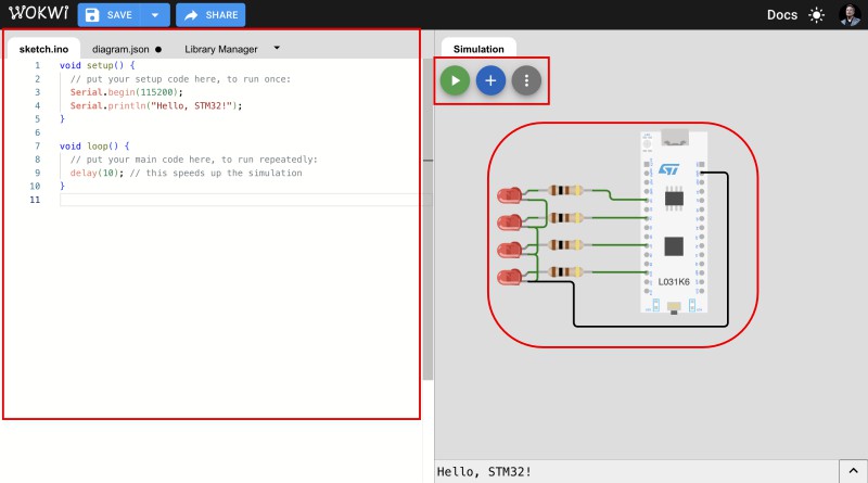 On the left is the code editor, and on the right is the STM32 circuit diagram. The highlighted buttons allow me to start and control the simulation.