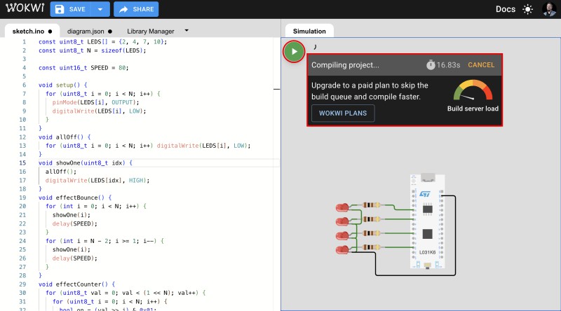 After clicking the run button, Wokwi begins compiling the project. It shows compilation time and offers a paid upgrade to speed up building.
