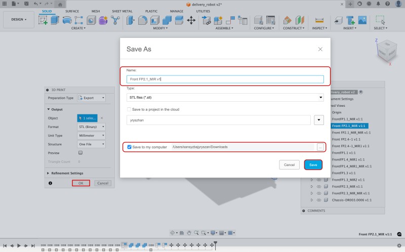 In this stage, I saved my model as an STL (.stl) file directly to my local computer. I named the file Front FP21_MIR v1 to keep my project files organized and version-controlled. I also verified that the “Save to my computer” option was checked, so the file would be stored locally instead of in the Fusion 360 cloud.