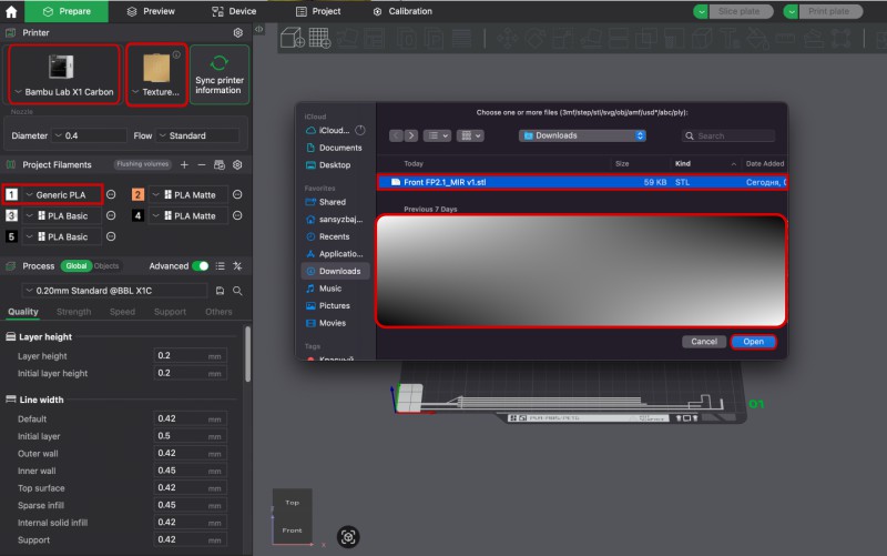 In this step, I opened the Bambu Studio slicer software and selected my Bambu Lab X1 Carbon 3D printer with a Textured PEI Plate as the printing surface. Then, I imported my previously exported STL file (Front FP21_MIR v1.stl) by clicking Open. This step loads my 3D model into the slicer, where I can preview and prepare it for printing.