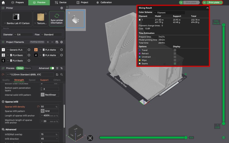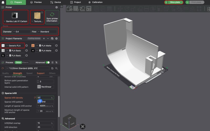 Next, I adjusted the infill and print settings. I used Generic PLA filament with a 0.4 mm nozzle and set the infill density to 50% for a balance between strength and weight. This setting is especially useful for mechanical parts like mine, which need to be durable but not too heavy. Once all parameters were configured, I proceeded to slice the model.
