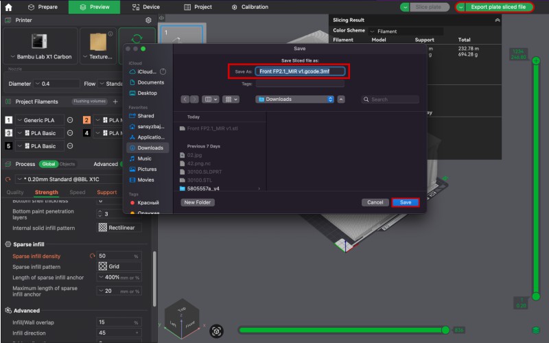 Finally, I exported the sliced file in .3mf format, naming it Front FP21_MIR v1.gcode.3mf. This file contains all the necessary print instructions — layer height, speed, temperature, and pathing — which can be directly read by the Bambu Lab X1 Carbon printer. I saved it to my computer, ready to transfer it to the printer for the actual 3D printing process.