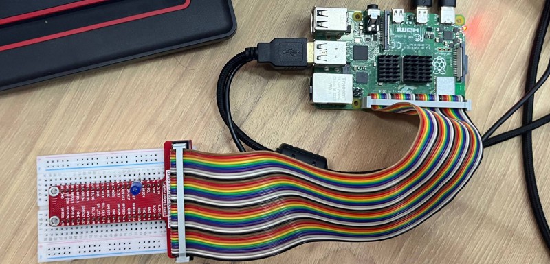 In the final photo, we connected the Raspberry Pi to a breadboard through a GPIO breakout module. We used a rainbow ribbon cable to access the GPIO pins easily while working on future tasks. This setup allowed us to test LEDs, buttons, and sensors directly from Node-RED.